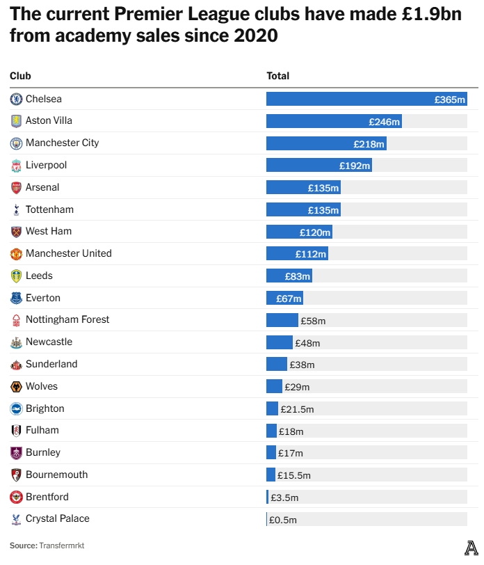 文章统计了近五个赛季英超20队出售自家青训球员所获转会费,其中切尔西以3.65亿英镑高居榜首。
